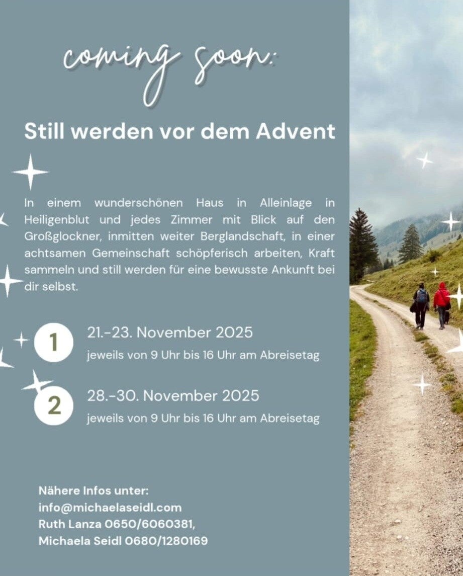 Zeit nur für Dich: Zwischen den kreativen Einheiten bleibt Raum nur für dich. Vielleicht lockt dich ein stiller Spaziergang am Waldrand, vielleicht das sanfte Wasser im Hallenbad Heiligenblut oder die Wärme der Sauna, die deinem Körper Gutes tut. Du kannst dich auch einfach auf die Terrasse setzen und den Blick über die Gipfel schweifen lassen. Ein Tagebuch- Eintrag hilft dir dabei, Gedanken und Eindrücke zu ordnen. So entsteht eine wohltuende Balance zwischen Ausdruck und Stille.